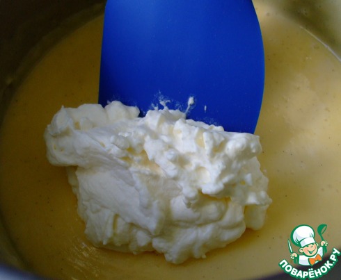 Пока масса охлаждается, взбить 250 гр. охлажденных сливок до устойчивых пиков.