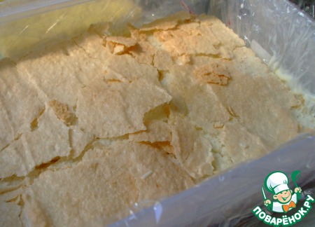 Вырезать два прямоугольника из бисквита. Дакуаз очень хрупкий, поэтому с ним нужно очень «нежно» обращаться!)) Но если и поломается – ничего страшного. Замажем, видно не будет!) У меня была пластиковая коробка размером 15 на 22 см и глубиной 8 см – вот позор! Формочки нужного размера не нашлось. ))). Я ее выложила по дну и по бокам пищевой пленкой. Вырезала два коржа 15 на 22 см. Один положила на дно коробки. Сверху ложкой нанесла малиновый кули, разровняла.