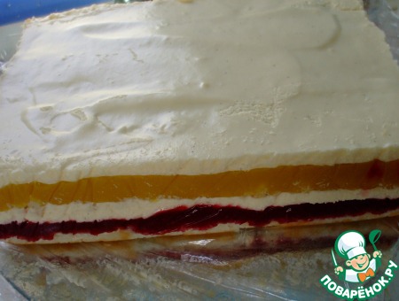 Поверх малинного кули вылила слой (около 0,8-1 см) мусса из белого шоколада. Сверху выложила второй бисквит. На него нанесла ложкой и разровняла лопаточкой манговый кули. Сверху вылила слой мусса. Мусс у меня остался. Т. е. продуктов для мусса можно брать меньше на 1/3.
