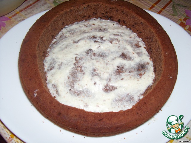 берем большой корж,если во время выпекания поднялась шапочка,то ее аккуратно срезаем,чтобы поверхность была ровной.далее,вырезаем из этого коржа круг,отступая от краев примерно 1-1,5 см.из получившегося коржа вырезаем еще один,меньшего диаметра(также отступая от краев 1-1,5 см).