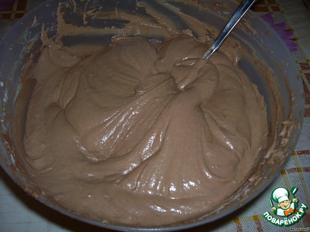 добавить 1,5 ст. сахара,ванилин,разрыхлитель,взбить.добавить размягченный маргарин,сметану,перемешать.постепенно всыпать какао и муку.