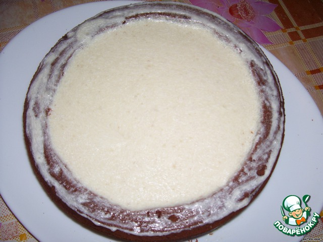собираем торт.кладем на блюдо один тонкий корж(полученный из коржа,который мы делили на два в 3-ем шаге),немного смазываем его кокосовой смесью,ставим на смазанный корж большой круг.