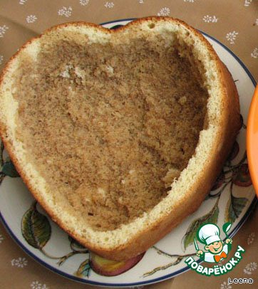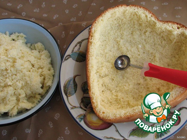Ложечкой осторожно вынуть мякоть и оставить стенки толщиной около 1 см. Крышку можно отправить на крошки, а можно оставить для полноты правдоподобности "шкатулки". Но она получается суховатой.