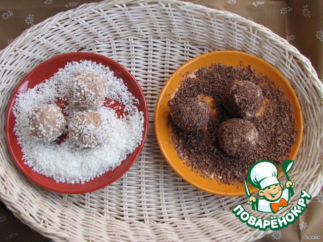 Из полученной массы скатываем шарики двух размеров (большие и маленькие) и половину обсыпаем кокосовой стружкой, другую половину - шоколадной стружкой. На фото только большие шарики. Маленькие делаем в 2 раза мельче.