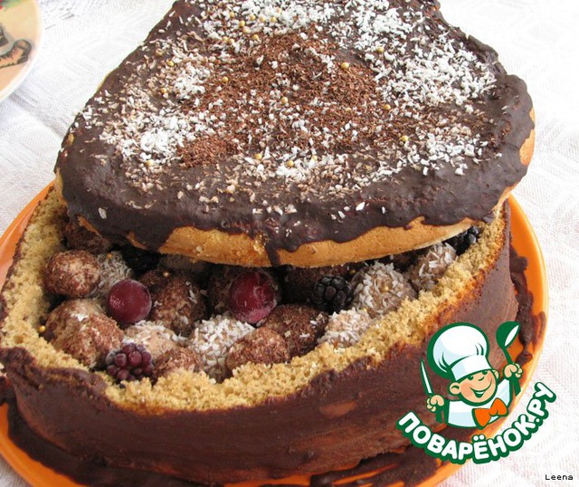 | Шкатулочка из бисквитного теста, заполненная нежными пирожными и ягодами. |