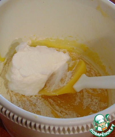 В 3 приема добавить к желтковой массе муку и белки, каждый раз перемешивая методом складывания.