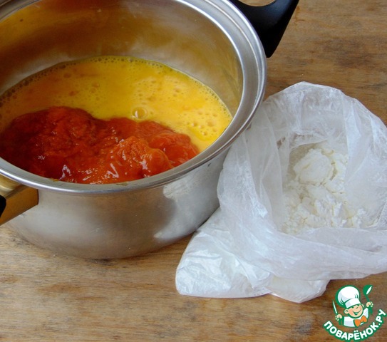 Для крема: Смешать в сотейнике 100 г яиц с пюре облепихи (если вы не дружите с облепихой, замените на пюре из ваших любимых ягод). Добавить 135 г сахара и 30 г крахмала. Хорошо взбить венчиком, чтобы не было комков.