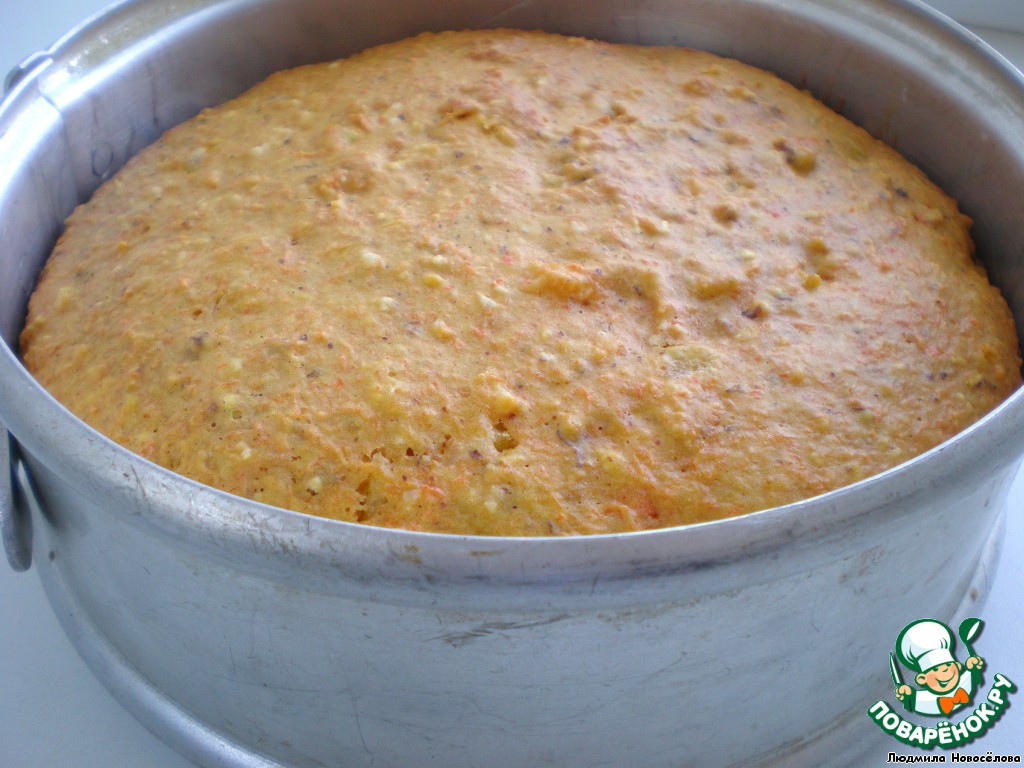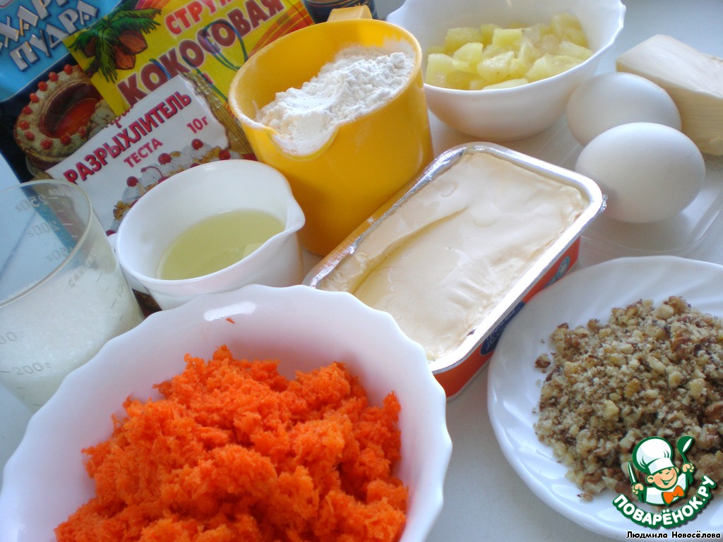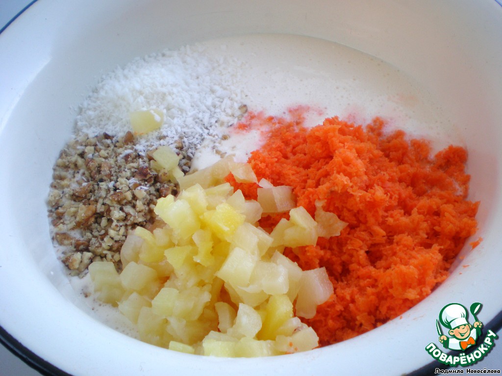 Нарезать ананас мелкими кусочками. Измельчить орехи. Морковь натереть на мелкой тёрке. Муку просеять с содой, разрыхлителем, солью и корицей.