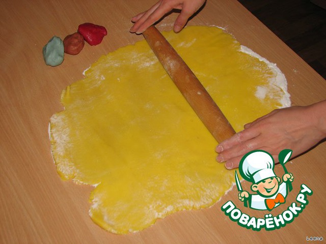 Массу разделить на 4 части и в каждую добавить пищевой краситель. Больше всего потребуется желтой мастики, немного коричневой и голубой и совсем чуть-чуть красной. Затем постепенно добавляя сахарную пудру замешиваем густое тесто. Затем раскатываем по кусочку и раскраиваем.