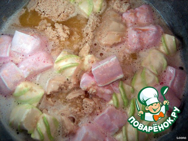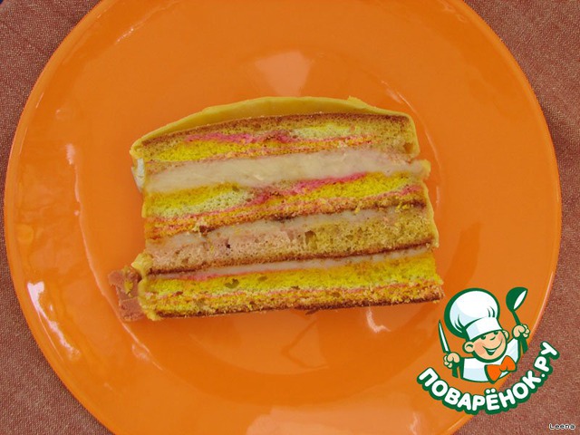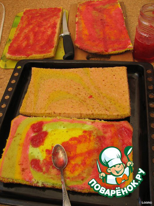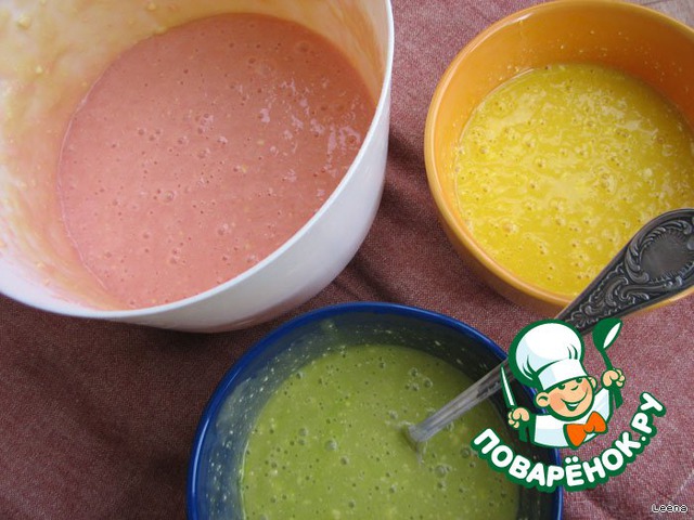 На подготовленный противень (хорошенько смазанный жиром и посыпанный мукой) поочередно выкладываем тесто, начиная от центра - две ложки розового, на него две ложки желтого, сверху две ложки зеленого и т. д. пока не закончится все тесто. Выпекаем в предварительно разогретой духовке при 180 гр. около получаса. Получается полосатая радужная структура.