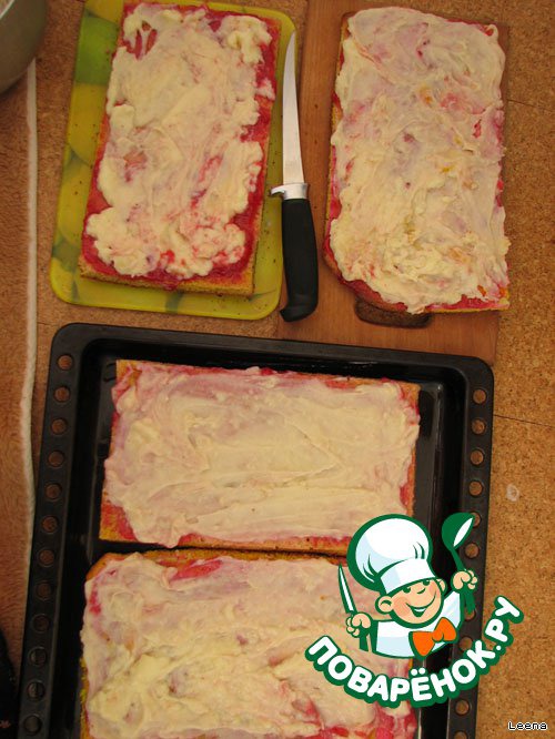 Два готовых коржа разрезаем пополам - получается 4 прямоугольных коржа. Их для пропитки я смазала клюквой, перетертой с сахаром. Но это может быть и смородиновый или вишневый сироп - что-нибудь кисленькое. Пропитку лучше не жалеть :-)