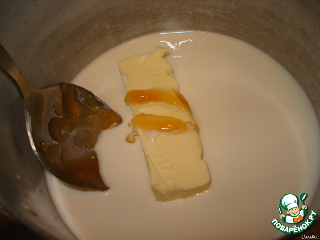 Займемся карамелью. Все ингредиенты для карамели смешать в кастрюльке, поставить на медленный огонь. Проварить минут 10, помешивая.