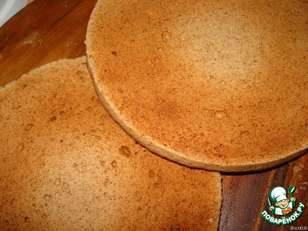 Бисквит поднимается вдвое. Разрезать вдоль на 2 коржа.