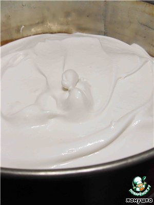 В форме диаметром 26 см испечь 2 тонких коржа, разделив тесто пополам. Взбить белки, постепенно всыпая 150 г сахара. На один из коржей выложить взбитые белки и поставить в духовку запекаться на 10 -12 мин.