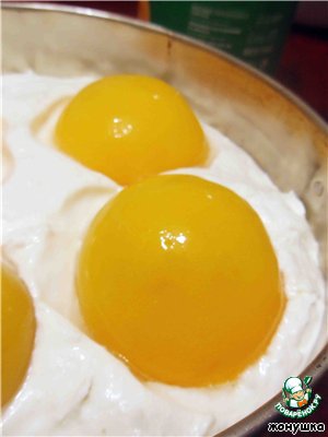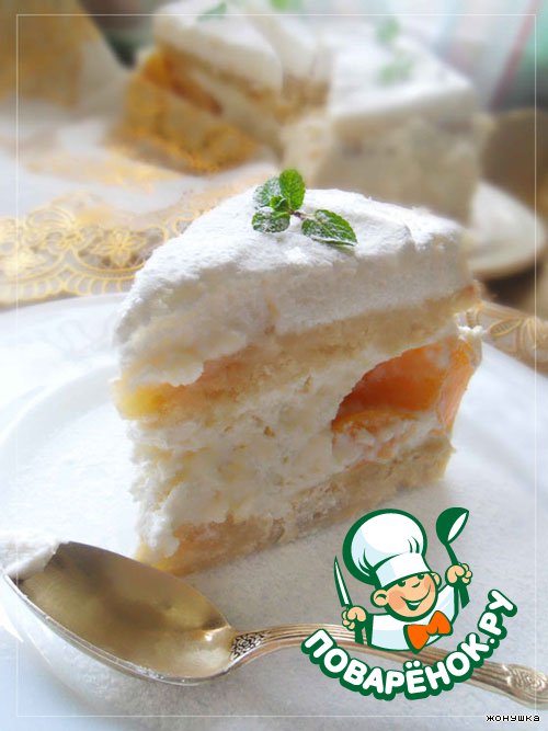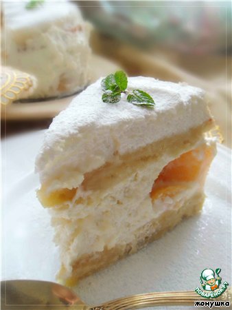 Корж заключить в кольцо, выложить творожный крем, сверху - кусочки персика, прикрыть коржом с безе и поставить в холодильник на 4 ч.