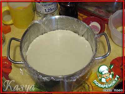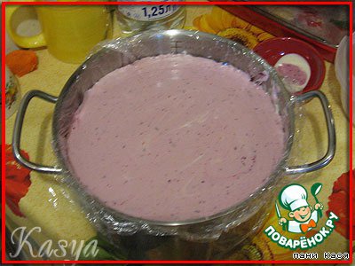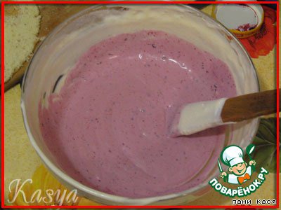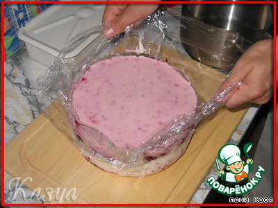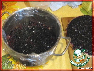 Кастрюльку застелили пленкой, выложили корж, промазали смородиной. Я сразу намазала и 2 корж.