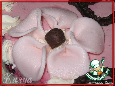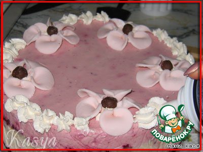 Намечаем взбитыми сливками (я свои не оставила, пришлось из балончика) 5 точек для цветков, можно бы и бока обработать, но я увлеклась верхом...