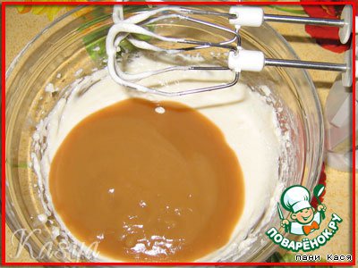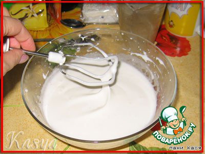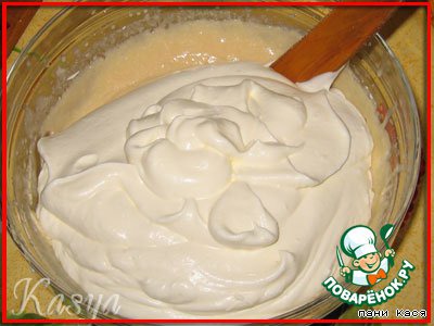 Белки взбиваем с сахаром (оставшиеся 2/3 от 200 г), но не до безе, а помягче, чтобы только-только форма начинала держаться