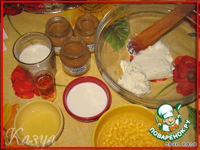 Сливки взбили со второй половиной сахара, в творожную массу добавили желатин и сливки. Поставили охлаждаться.