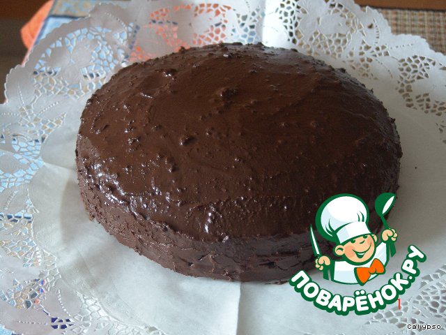 Для глазури растопить 200 г горького шоколада с 50 г сливочного масла. Готовую глазурь остудить до того момента, когда она с легкостью будет наноситься на торт и не стекать. Если глазурь все же стекла, то дождитесь ее застывания и собрав ее с краёв блюда с помощью кондитерского шпателя нанесите на боковые части торта.
