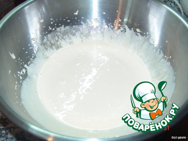 Желтки взбить до бела с 2/3 оставшегося сахара, смешать муку с разрыхлителем. Муку лучше взвесить на кухонных весах.