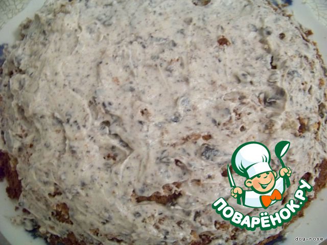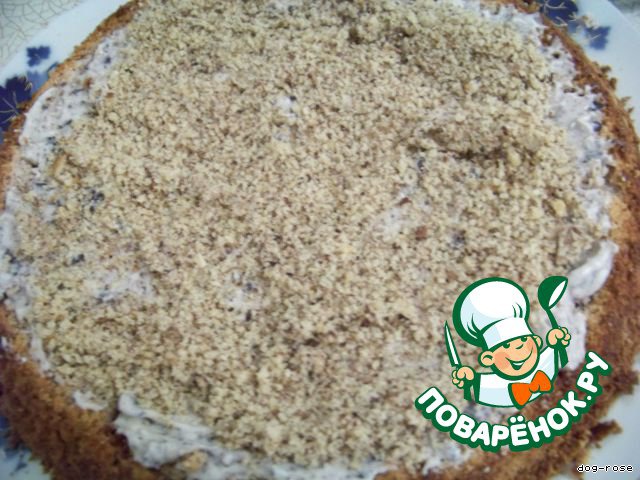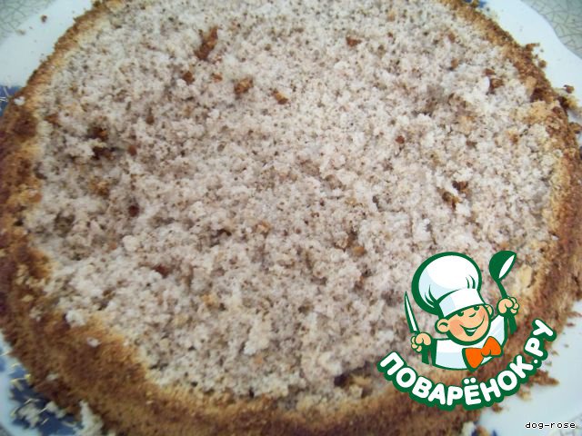 Намазываем первый корж кремом, высыпаем остаток молотых орехов.
