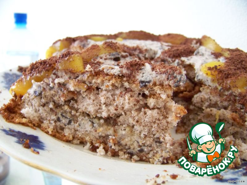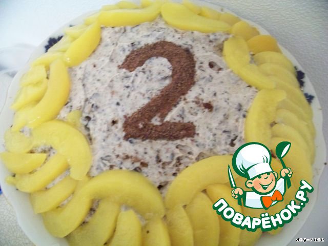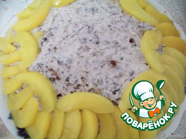Теперь украшаем по усмотрению. У меня по краям выложены персики, сверху присыпаны молотым шоколадом,