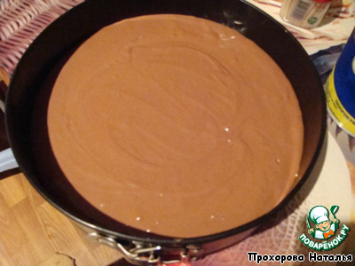 Перекладываем тесто (как очень густая сметана) в разъемную форму (у меня была диаметром 26 см), застеленную пергаментом. И выпекаем в разогретой духовке до 180 градусов в течение 50 минут. При выпечке дверцу духовки не открывать!!!