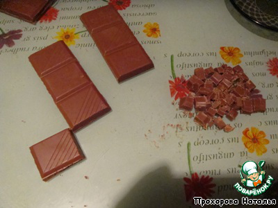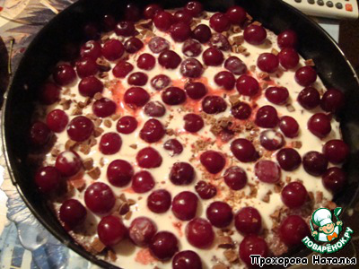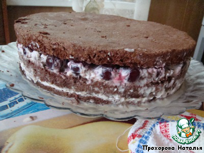 Теперь выкладываем половину вишни, заливаем половиной сметанного крема (если будете им пропитывать и верхний корж, то заливаем треть крема, я делала масляным кремом под мастику). Посыпаем шоколадом. Накрываем вторым коржом и повторяем то же самое... И затем накрываем третьим коржом и отправляем тортик в холодильник.