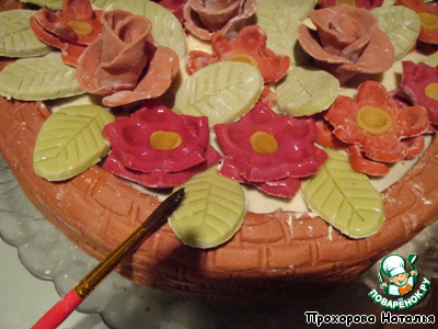 И кисточкой аккуратно покрыть мастику. Водка испаряется, она абсолютно никак не отражается на вкусе мастики... Она будет блестеть, и не будет сильно твердеть...