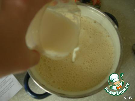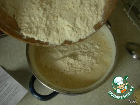 Смешиваем, всыпаем разрыхлитель и добавляем оставшиеся молоко и муку.