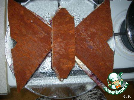 Когда торт чуть застыл, достаем его и разрезаем. Должно получиться прямоугольное "тельце" и 2 треугольных "крылышка".