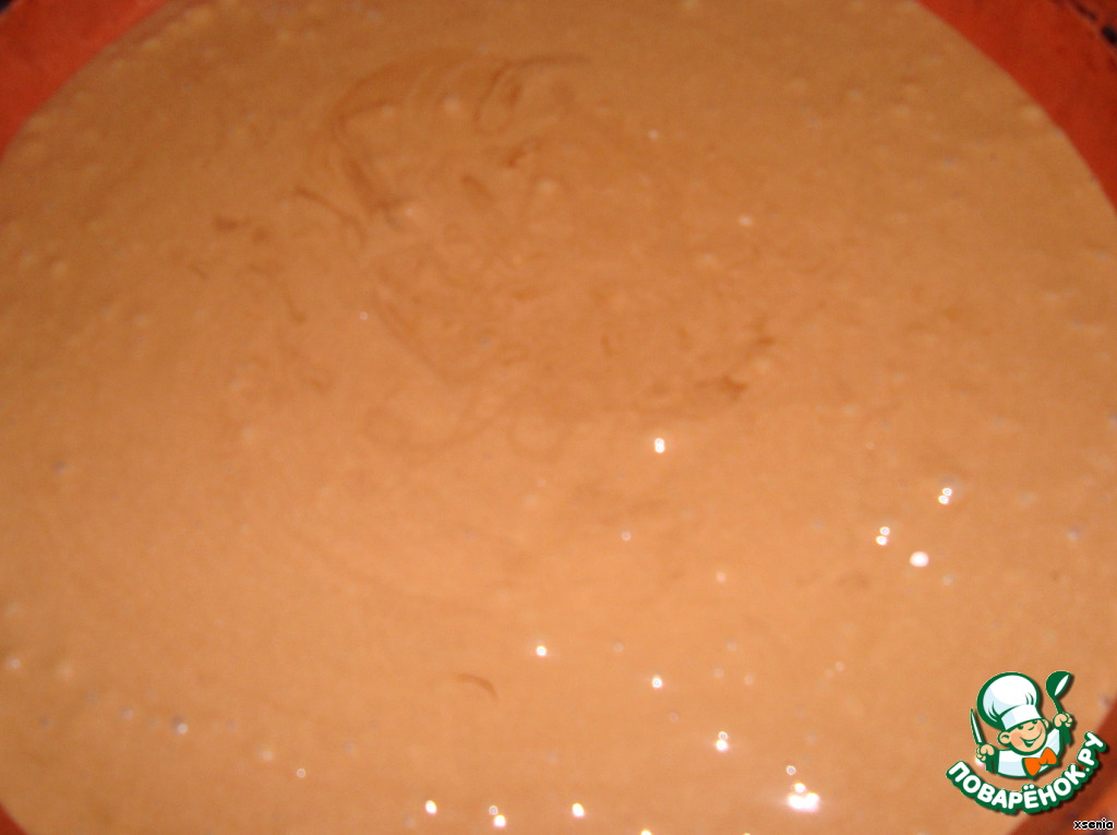Добавляем муку, соду и крахмал. Затем вводим взбитые в крутую пену белки. Хорошо перемешаем. Выливаем в форму и отправляем в разогретую до 180 градусов духовку на 45 минут.