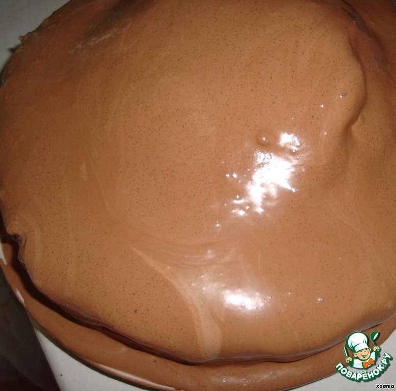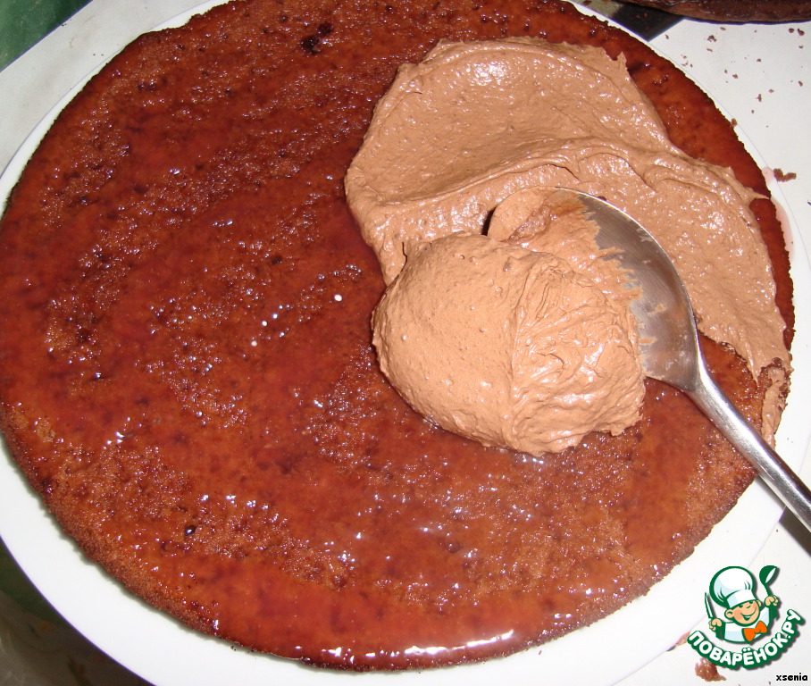 Крем: Белок взбиваем, постепенно добавляя сахар. Взбиваем до тех пор, пока сахар полностью не растворится. Шоколад растопим на водяной бане, вводим во взбитый белок, хорошо перемешаем. Затем взбиваем с мягким маслом.