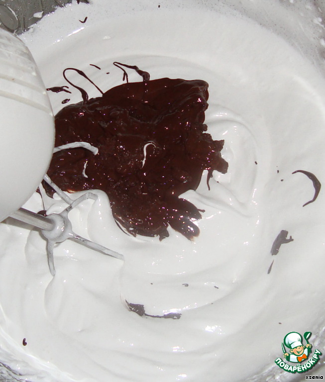 Пока мы делаем мусс, торт отправляется в холодильник застывать. Принцип тот же что и у крема. Белки взбиваем с сахаром. Шоколад растопим, смешаем с белками. Хорошо взбиваем.