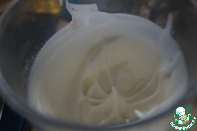 За 10-15 минут до финальной подачи нашего торта, вытаскиваем нашу заготовку торта из морозилки, ставим духовку на разогрев и начинаем готовить покрытие. Взбиваем миксером 3-4 белка с 3 столовыми ложками сахара. Взбиваем до белых пиков.