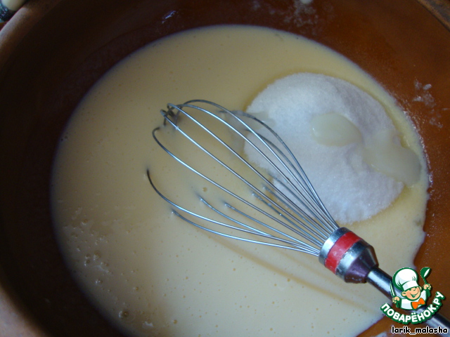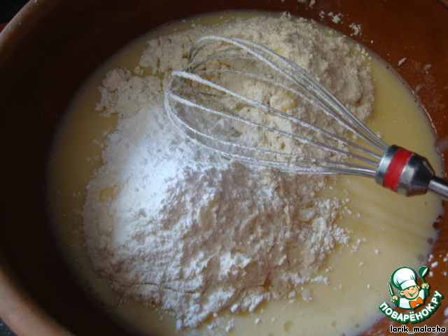Добавить сгущенку, сахар, муку и разрыхлитель.