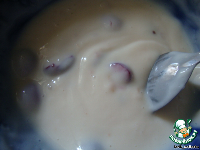 Коржи охладить. Приготовить крем: взбить сметану, сахар и ванильный сахар. Добавить нарезанные ягоды (добавьте по своему вкусу и желанию) - у меня здесь черешня.