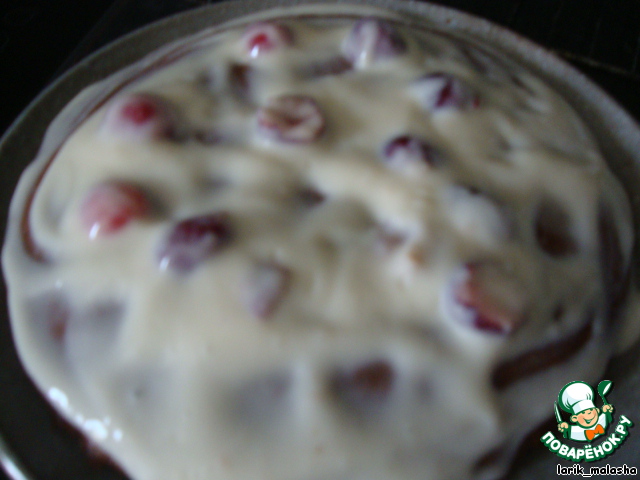 Собираем тортик - нижний слой (шоколадный), крем, верхний слой (белый).
