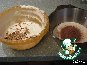 Разделить полученную массу на две равные половины. В одну добавить грецкие орехи, в другую какао. Тщательно перемешать. Вместо орехов можно использовать изюм, чернослив, курагу, кусочки фруктов, вообщем то, что Вам нравится!