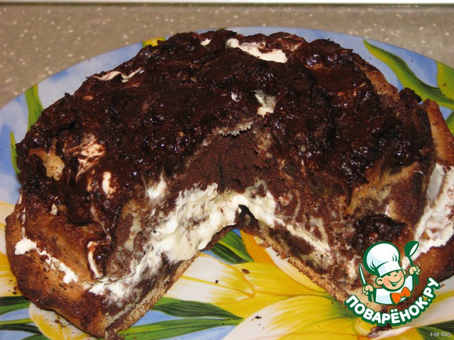 Готовим глазурь: в емкость вливаем молоко, добавляем сливочное масло, когда масло растопится, туда же отправляем какао, все тщательно перемешиваем, если густо - добавьте молока, если жидко - еще какао. Получившейся глазурью поливаем сверху наше "произведение". Вот и все.