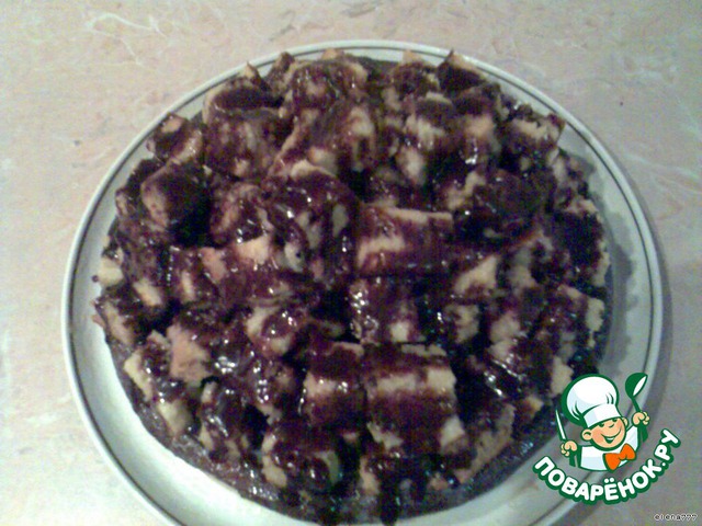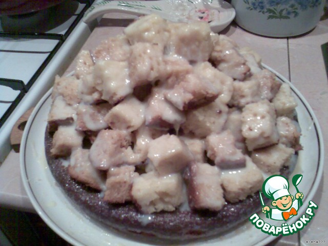 Уложить порезанные светлые кубики на тёмный корж горкой в хаотичном порядке и полить сверху оставшейся сгущёнкой. Тесто нежное-пропитывается очень быстро.