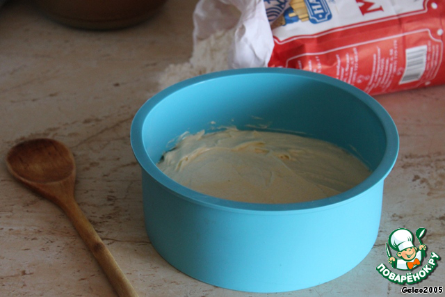 Тесто выложить в форму (тесто должно занимать не больше 2/3 формы). Если это силиконовая форма, ничем смазывать и присыпать не надо, если другая, то просто вырежьте по дну формы кусок пергамента (бумаги для запекания) и положите на дно, опять же ничем смазывать не надо. Бисквит уже содержит масло и не прилипнет.