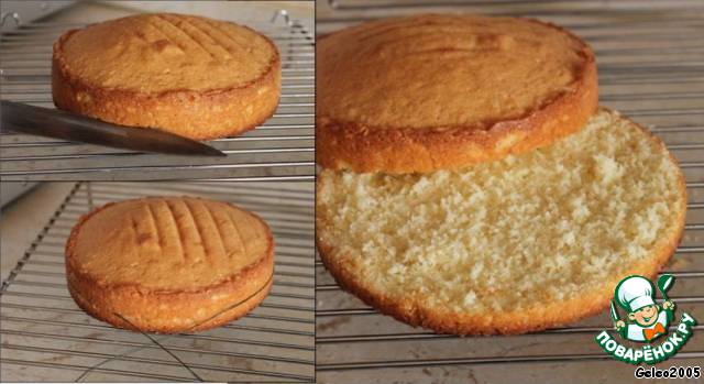 А режу я его с помощью нити. Сначала ножом делаю надсечку по кругу, по этой надсечке обматываю ниткой, скрещиваю концы и тяну их в разные стороны. Таким способом получается ровно отрезанный корж и той толщины как надо.