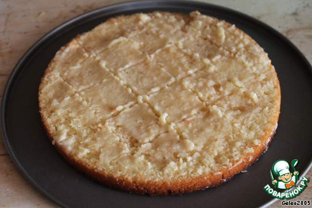 Нижний корж-основу надрезать решеткой (не до конца) и пропитать соком, в моем случае "Агуша" яблоко-банан.