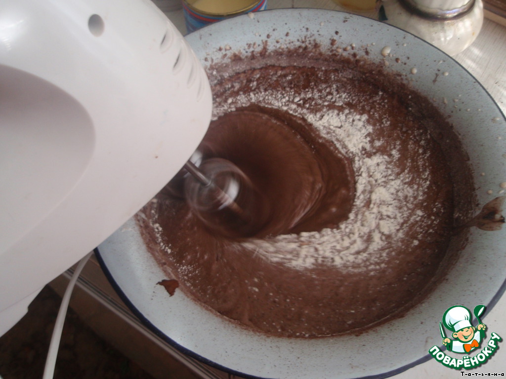 добавляем муку и на минимальной скорости взбиваем до однородной массы.