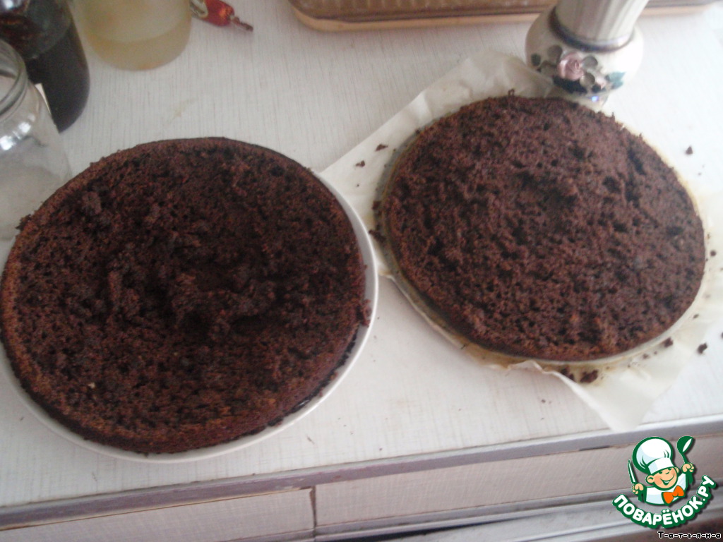 Готовый торт разрезать пополам. Пускай остынет, затем смазать кремом