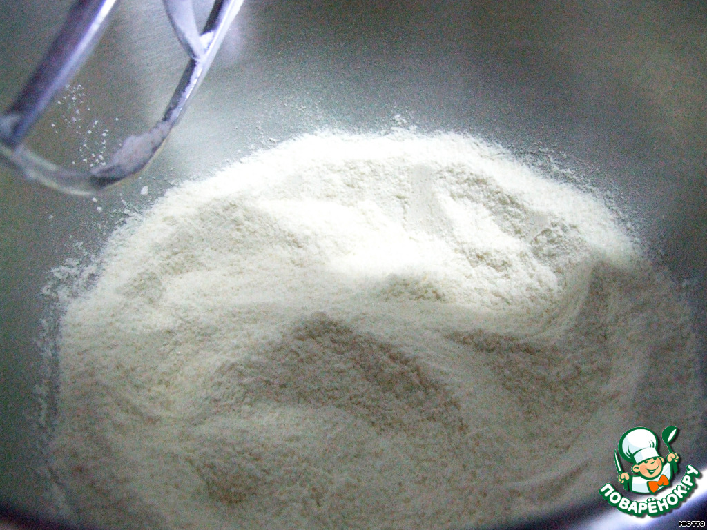 Все сухие ингредиенты для теста (просеянная мука+сахар+соль+разрыхлитель) на медленной скорости миксера размешаем секунд 30.