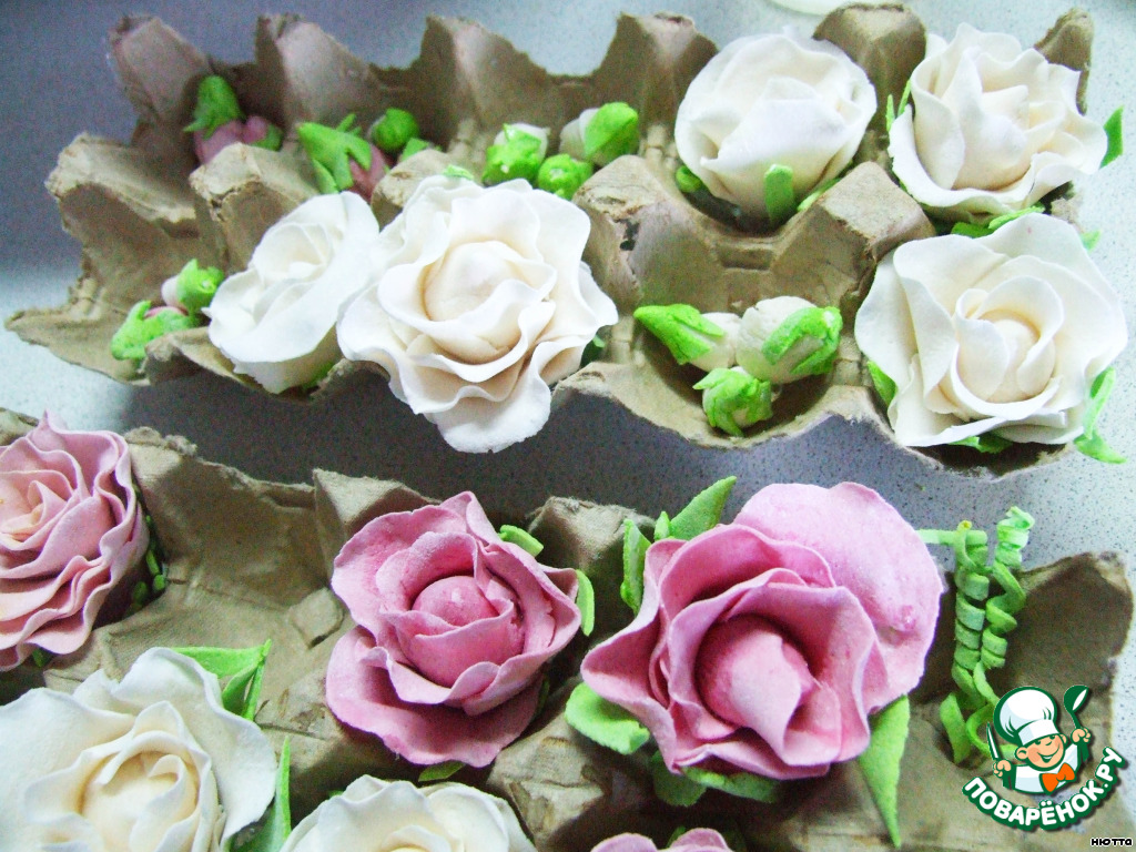 Для мастики я использовала суфле Бон Пари, эти суфлешки бело-розовые, я их разделила и делала белую и розовую мастику (суфле разогрела в микроволновке 40-50 секунд и замешивала этакое тесто, с добавлением сахарной пудры). Цветы из мастики делала за два дня до праздника, чтобы они просохли, кстати, для просушки очень подходят ячейки от яиц! Делаем цветы на свой вкус, цвет и размер!