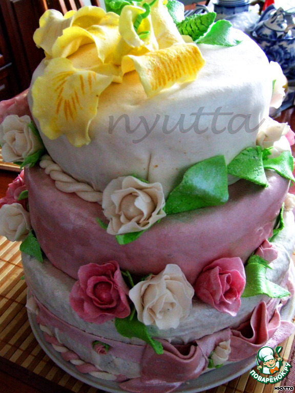 Для своего торта я делала 4 замеса теста: два замеса для формы диаметром 28 см, один замес теста разделила на формы 24 и 20 см и ещё один замес разделила так же, в итоге получилось 6 коржей. Крем в рецептуре указан так же для одного замеса, его тоже повторяла. Обтягиваем все подготовленные бисквиты мастикой и украшаем...украшаем...как подсказывает вам фантазия! Удивительно интересное занятие!